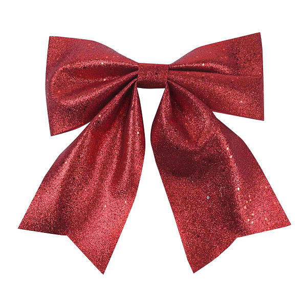 Бант выполнен из полимерного материала. Его поверхность декорирована мелкими блестками, сияющими в свете гирлянд. Таким бантом можно украсить новогоднее дерево и помещение, в котором отмечается праздник.