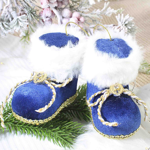 Украшение елочное Башмачки с белой меховой опушкой и золотистым шнурком синие 12см