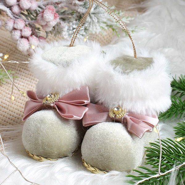 Башмачки имеют компактный размер 7 см и легко крепятся на ветки с помощью золотистой петельки. Изделия изготовлены из мягкого текстиля, приятного на ощупь.