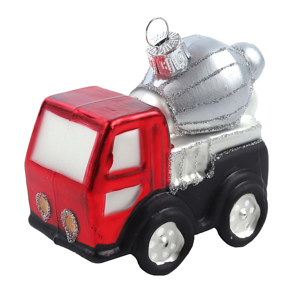 Новогоднее елочное украшение в классическом стиле в виде миниатюрной бетономешалки, выполненной из стекла длиной 7,5 см. Фигурка расписана в ярких и реалистичных цветах: красная кабина, серебристый барабан бетономешалки и черные колеса, что придает игрушке стильный и праздничный вид. Украшение оснащено серебристым шнурком для удобного подвешивания на елку, создавая атмосферу уюта и оригинальности в новогоднем декоре.