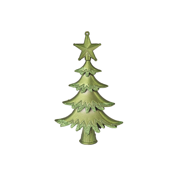 Игрушка в виде четырехъярусной елки с большой звездой наверху интересно смотрится в оформлении новогодней лесной елки. Зеленый цвет изделия хорошо сочетается с природной зеленью настоящего дерева.