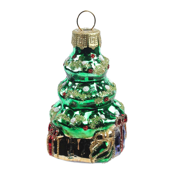 Новогоднее классическое украшение в виде миниатюрной елочки, выполненное из стекла высотой 6,5 см. Фигурка расписана в зеленых и золотистых тонах с блестящими акцентами, изображающими иголки и праздничные подарки у основания. Елочка создает атмосферу уюта и праздника, идеально дополняя новогодний декор. Оснащена золотистым шнурком для удобного подвешивания на елку.