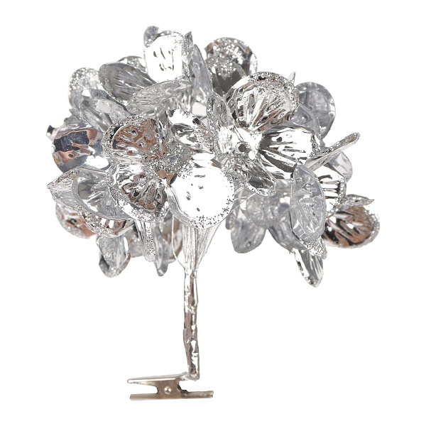 Форма украшения напоминает пышную гортензию; лепестки изящно взаимодействуют с падающим светом, создавая волшебную атмосферу. Прочная металлическая прищепка надежно фиксирует цветок на ветках елки.
