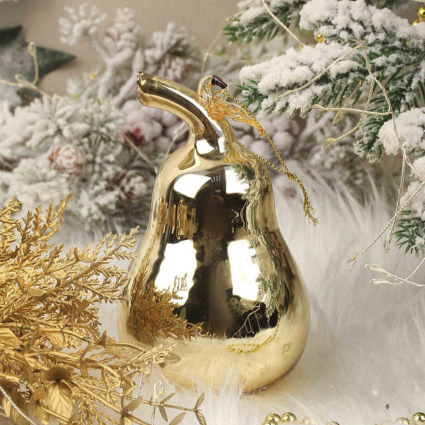 Украшение виде груши выполнено в стиле лофт с глянцевым золотистым покрытием, которое придает изделию стильный и праздничный вид. Изготовлено из стекла высокого качества, что обеспечивает долговечность и привлекательный блеск. Высота украшения составляет 12 см, что делает его компактным и удобным для размещения на елке или в новогодних композициях. Металлическое кольцо с золотистой ниткой позволяет легко подвесить изделие в любом удобном месте, создавая атмосферу праздника и уюта.