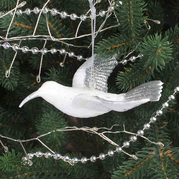 Изящное елочное украшение в виде белого колибри, выполненное в стиле лофт из пластика. Длина изделия составляет 14 см. Украшение декорировано серебристыми блестящими акцентами на крыльях и хвосте, что придает ему легкость и утонченность. Колибри оснащен подвеской, позволяющей удобно развесить его на новогодней елке. Этот воздушный и стильный декоративный элемент прекрасно дополнит праздничный интерьер.