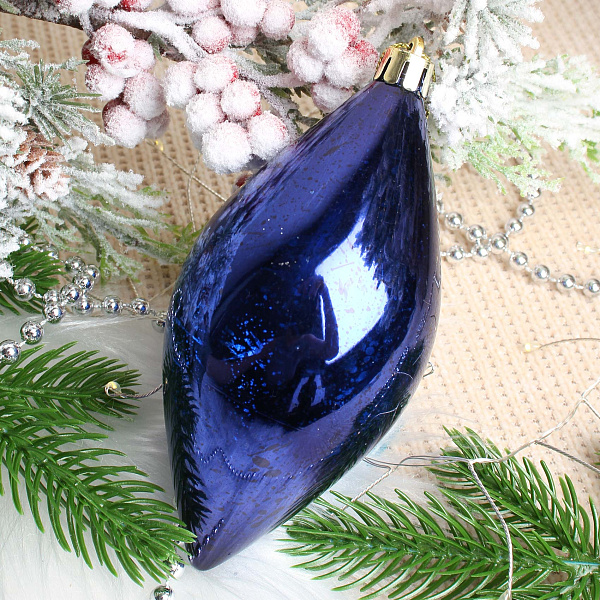 Утонченное елочное украшение в форме капли, выполненное из пластика с синим покрытием. Высота украшения составляет 13 см. Изделие выполнено в винтажном стиле и отличается оригинальной изогнутой формой и эффектом состаренного металла, создавая атмосферу старинного блеска и праздничного уюта. Украшение оснащено тонкой подвеской для удобного крепления на новогодней елке, идеально вписывается в классический или ретро-стиль новогоднего декора.