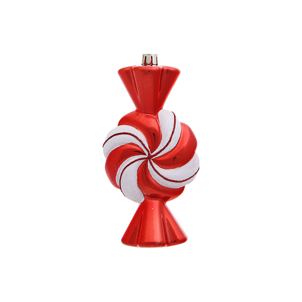 Необычная елочная игрушка для украшения новогодней елки. Отличается новогодним дизайном в виде конфеты в красно-белом фантике с рельефной формой. На одной из граней находится металлическая деталь для золотой нити, которая позволит закрепить елочную игрушку на ветвях елки в висячем положении. Игрушка полая внутри. Она легкая, не будет сгибать и ломать ветки, на которых висит. Период эксплуатации не ограничивается (в случае правильного использования и хранения), можно применять повторно. Изготовлено из пластмассы.