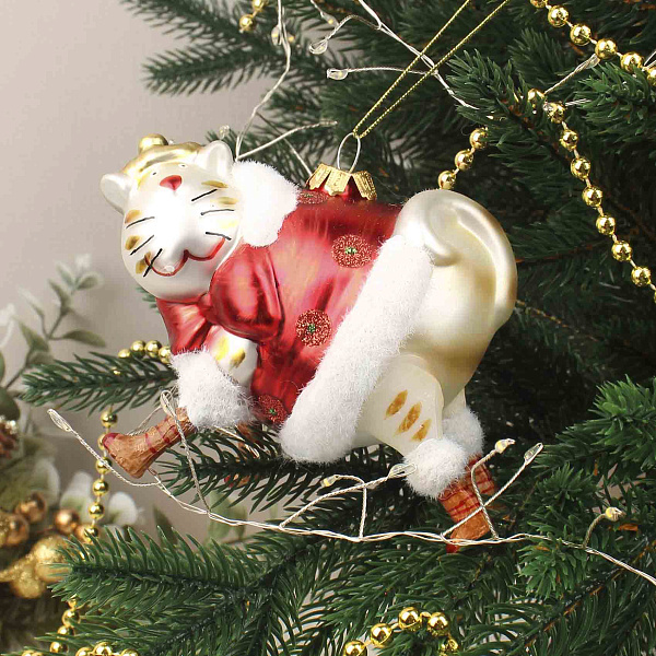 Украшение елочное Кот в красной шубке золотистый стекло 10см