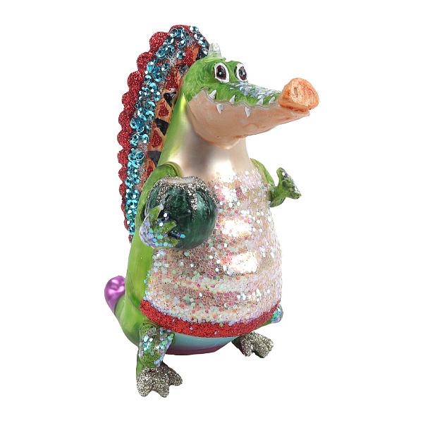Ёлочное украшение в виде забавного крокодила-индеейца — это оригинальный и яркий декоративный элемент для праздничного оформления. Изготовлено из стекла и украшено яркими блестками и росписью, что придаёт игрушке живой и выразительный образ. Крокодил одет в традиционный индейский головной убор с перьями красно-голубого цвета и держит в лапах зелёный предмет, создавая эффект праздничного персонажа с уникальным стилем.
