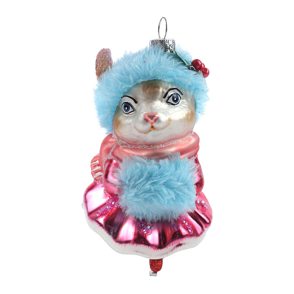 Ёлочное украшение в виде забавного кролика на коньках — это оригинальный и волшебный декоративный элемент для новогоднего праздника. Изделие выполнено из стекла с яркой и выразительной росписью, дополнено текстильными деталями — пушистой голубой шапочкой и муфтой, что придаёт фигурке уют и живость. Кролик одет в розовое платье с блестящими вставками и красными коньками с эффектом искр.