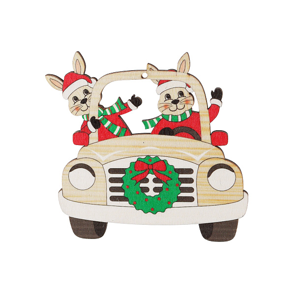 Украшение елочное Кролик на машине деревянный в ассортименте