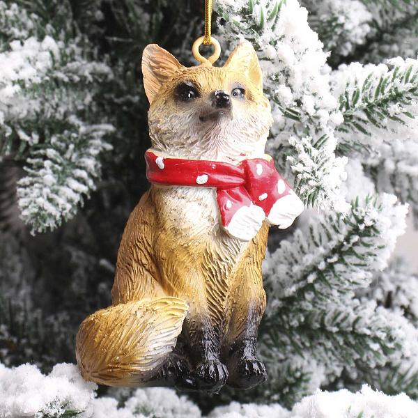 Новогоднее украшение в виде рыжей лисы с черными лапками, выполненное из полирезина с реалистичной детализацией. Лиса сидит и украшена красным шарфом в белый горошек, что придает изделию праздничный и уютный вид. Высота фигурки составляет 8,5 см — такой размер позволяет украшению стать заметным элементом на елке или в новогоднем интерьере. Благодаря небольшому весу и удобной петельке лису легко повесить на елочную ветку или другой декор.