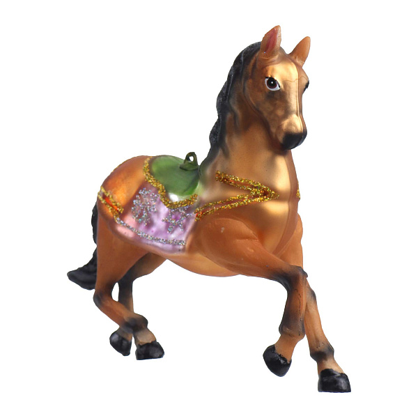 Елочное украшение в виде лошадки символа года 2026 выполнено из стекла и имеет длину 11 см. Фигурка ярко раскрашена с деталями в виде седла и гривы. Лошадка легко крепится на дерево с помощью золотистой нити. Украшение подойдет для украшения как новогодней елки, так и других праздничных композиций. Изделие хорошо передает образ животного и добавит разнообразия декору.