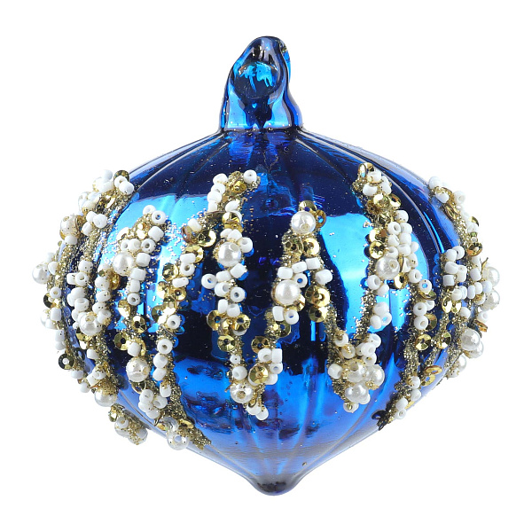 Украшение елочное Луковица с узором из белого бисера с золотыми элементами синий стекло 8см