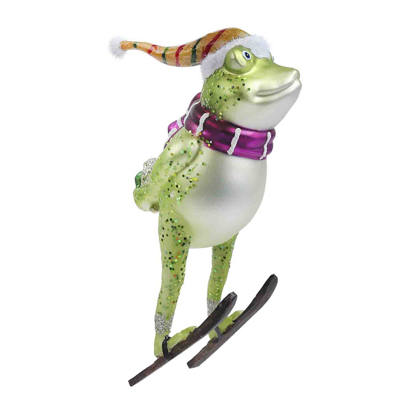 Новогоднее классическое украшение в виде забавной фигурки лягушки Бориса на лыжах, выполненное из стекла высотой 16 см. Лягушка окрашена в яркий зеленый цвет с блестящими акцентами, одета в теплый полосатый колпак с помпоном и фиолетовый шарф. На спине у лягушки небольшой зеленый подарок с блестками, а сама она стоит на коричневых лыжах в веселой и динамичной позе. Украшение оснащено золотистым шнурком для удобного подвешивания на елку.