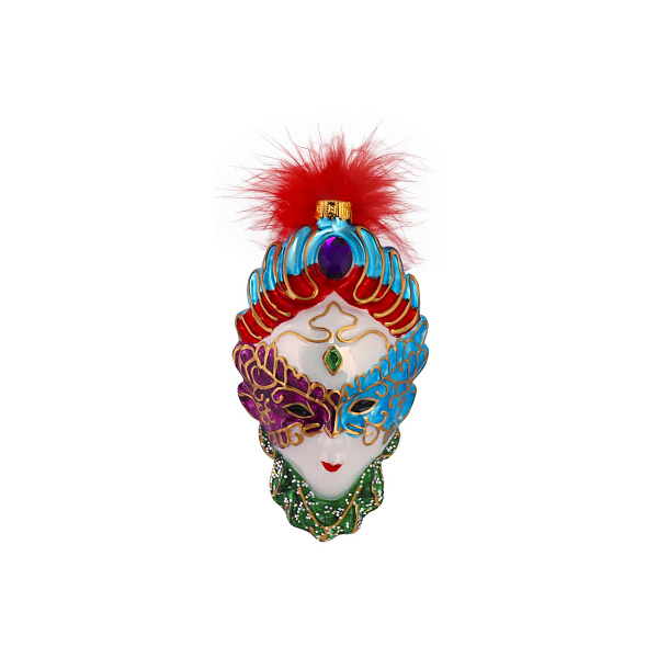 «Карнавальная маска» – это яркое елочное украшение в венецианском стиле. Игрушка выполнена из стекла и разукрашена блестящими эмалевыми красками. Это настоящее произведение искусства с рельефными узорами, стразами и большим пуховым пером сверху. Маска выглядит ярко и стильно. Она сразу обращает на себя внимание необычным дизайном. Благодаря аккуратному исполнению игрушку можно долго изучать и разглядывать. Украшение будет эффектно смотреться на елках в разных стилевых решениях и цветовой гамме. Фигурка венецианской маски станет отличным новогодним подарком для друзей, коллег на работе и родственников.