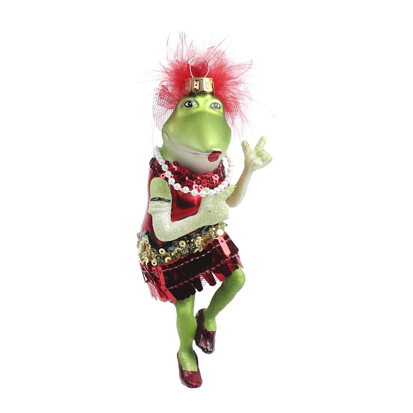 Новогоднее классическое украшение в виде забавной лягушки-модницы Луизы, выполненное из стекла высотой 15 см. Фигурка в форме зеленой лягушки в эффектном наряде — блестящее красное платье с пайетками и меховой красный воротник, дополненное ярким красным аксессуаром на голове. Лягушка позирует с изящной жестовой выразительностью, создавая атмосферу веселья и праздничного шарма. Украшение оснащено золотистым шнурком для удобного подвешивания на елку.