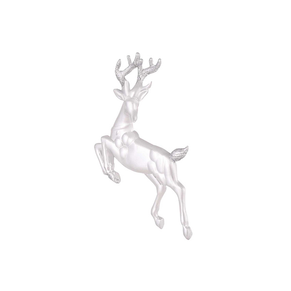 Олень выполнен из износостойкого пластика, имеет детальную прорисовку мышц и как будто застыл в прыжке. Поверхность изделия имеет глянцевое серебристое напыление, рога и хвост животного покрыты переливающимся глиттером, который будет эффектно блистать на фоне хвои благодаря новогодним гирляндам.