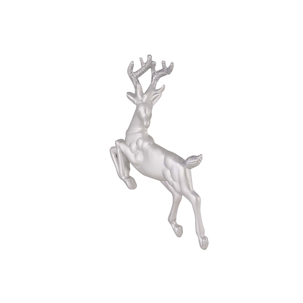 Елочное украшение «Олень» станет изюминкой новогодней елки. Игрушка выполнена из пластика и покрашена серебряной матовой краской. Серебристыми блестками покрыты рога, копыта и хвост. Они будут красиво мерцать под светом от гирлянды.