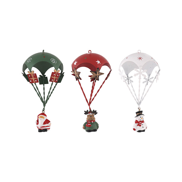 В составе набора - три металлических парашютика красного, белого и зеленого цветов. На красном парашюте зафиксирована фигурка лося, на белом – снеговика, на зеленом – Деда Мороза.