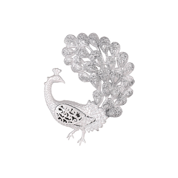 Изготовлена игрушка из пластика, покрыта серебряной краской и матирующим составом. В свете елочных гирлянд павлин смотрится особенно изящно и живописно. Дизайн дополнен тонкой цепочкой для подвешивания на ветку.