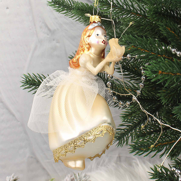 Ёлочное украшение в виде фигурки принцессы с лягушонком — оригинальный и сказочный декоративный элемент, вдохновлённый классическими сказками. Фигурка выполнена из стекла с детальной прорисовкой лица и волос, окрашенных в рыжеватый оттенок с лёгким блеском. Принцесса одета в изящное платье с воздушной сетчатой юбкой и золотистой отделкой, что придаёт изделию особую лёгкость и изысканность.