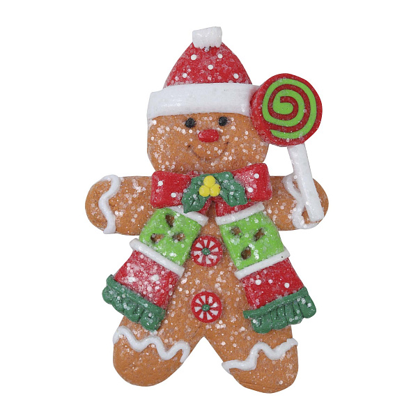 - Дизайн: пряничный человечек с шапочкой, шарфом и леденцом