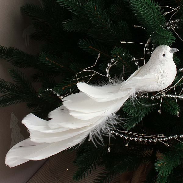 Совершенно необязательно изучать символику и приметы, чтобы быть в курсе: белая птица — это предвестник благополучия, радости и счастья. Квалифицированные художники взяли этот прекрасный образ в качестве основы украшения на зажиме - белоснежную птицу, которая олицетворяет умиротворение и гармонию. Кроме того, они добавили несколько эффектных штрихов: натуральные перья нежного белого оттенка, пушистый корпус и ослепительный серебристый глиттер.