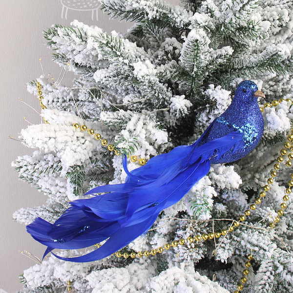 Синяя птица изготовлена из пенопласта, усыпанного ярким глиттером. Её крылья выполнены из блестящих пайеток, а хвост - из пушистых натуральных перьев, декорированных блёстками. Благодаря зафиксированной внизу изделия клипсе птицу можно закрепить на абсолютно любом предмете интерьера.