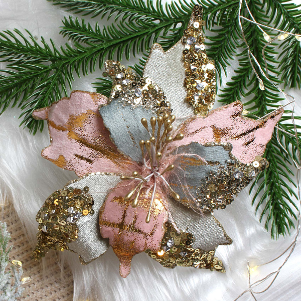 Украшение крепится на ветку с помощью металлической прищепки. Конструкция позволяет легко размещать декор на елке или других элементах новогоднего оформления. Цветок хорошо смотрится как в классических, так и в современных композициях.