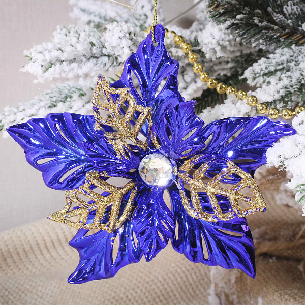 Елочное украшение «Пуансеттия» выполнено в форме яркого цветка с крупными лепестками насыщенного темно-синего цвета. Золотистые элементы в виде листьев добавляют изделию выразительности и оригинальности. Центральная часть украшения украшена прозрачной стразой. Диаметр цветка: 11 см. Украшение подвешивается на тонкую золотистую нить. Легкий и объемный дизайн делает украшение заметным и привлекательным на ветках дерева.