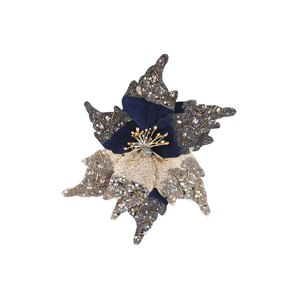 Украшение елочное Пуансеттия сине-золотая велюровая 20см