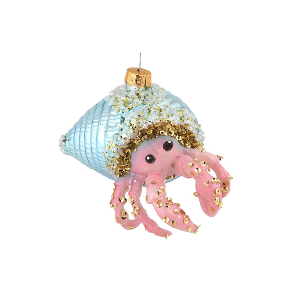 Симпатичный рак-отшельник в перламутровой раковине станет достойным украшением новогодней елки. Игрушка оформлена с использованием нежных цветов, щедро декорирована сверкающими бусинами. Она не затеряется среди колючих веток, развлечет взрослых, удивит детей. Поверхность изделия будет загадочно мерцать в полумраке, создавая оригинальный визуальный эффект. Блики помогут создать особую атмосферу, присущую главному зимнему празднику.