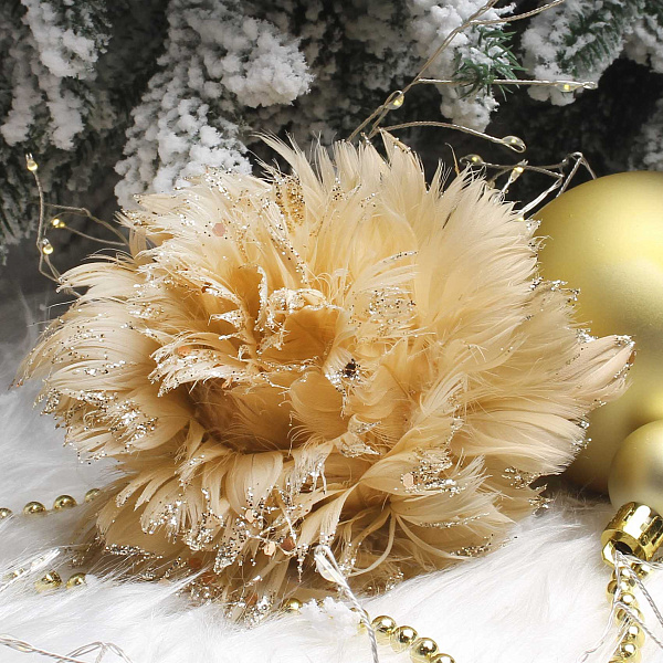 Елочное украшение цветок из перьев с блестками золотой 10см