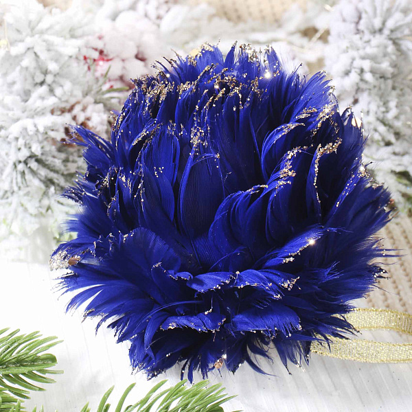 Ёлочное украшение изготовлено из воздушных перьев, усыпанных ярким глиттером. Оно подвешивается на дерево с помощью нитей из органзы.