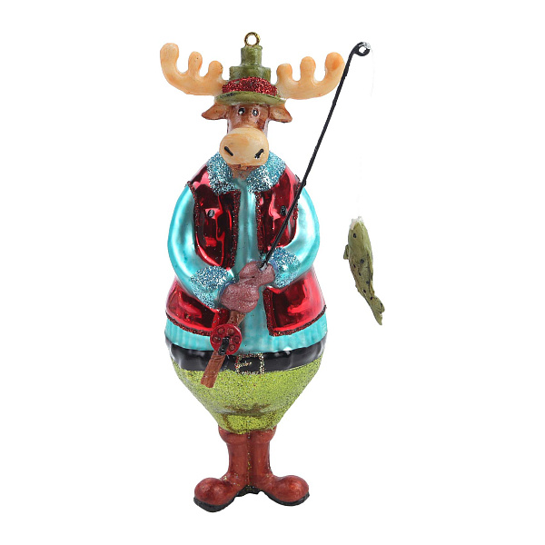 Ёлочное украшение в виде забавного лося-рыбака — это яркий и оригинальный декоративный элемент для новогоднего праздника. Фигурка выполнена из стекла и ручной росписью в насыщенных, жизнерадостных цветах. Лось одет в голубую рубашку, красную жилетку и зелёные штаны, на голове у него шляпа, а в руках — удочка с пойманной рыбой, что придаёт ему колорит и игровую динамику.
