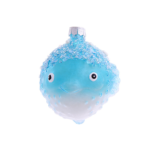 Елочные украшения в виде ярких рыбок вида «Фугу» из стекла добавят азиатского колорита на новогоднюю елку. В ассортименте представлено два варианта: с пайетками и белыми крапинками. Рыбки выполнены в сочетании голубого и розового цветов с градиентными переливами. Тело рыбки рельефное. В верхней части игрушки имеется крепление для петельки.