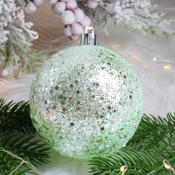 Елочное украшение — шар блеск в мятном цвете с диаметром 8 см, выполненное в ярком и праздничном стиле. Изготовлен из пластика с покрытием из крупных блестящих элементов, создающих эффект переливов и сияния на поверхности. Украшение оснащено подвеской с ниткой для удобного размещения на елке.
