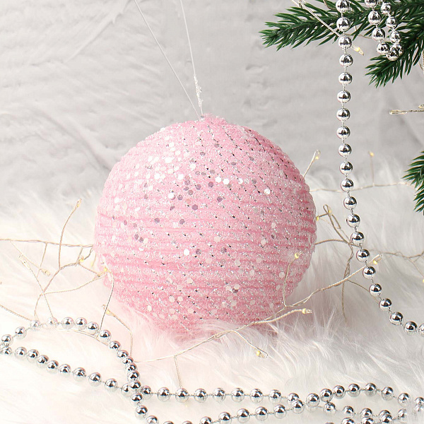 Новогоднее украшение — шар нежно-розового цвета диаметром 10 см, выполненный из пластика. Поверхность шара украшена блестками и мелкими пайетками, создающими праздничный мерцающий эффект. Легкий и яркий, этот шар станет стильным и изящным дополнением к новогоднему декору елки или праздничного интерьера. Оснащен прозрачной подвеской для удобного крепления.