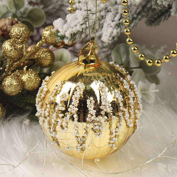 Украшение елочное Шар блестящий с узором из белого бисера золотистый стекло 8см