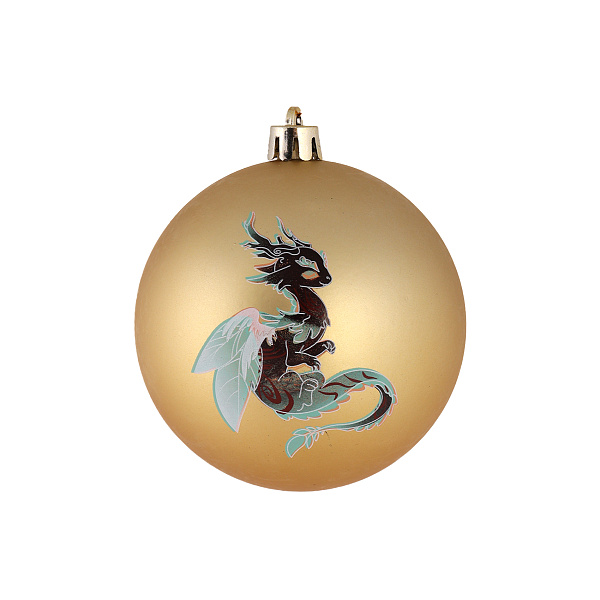 Золотистый шар украшен стильным изображением дракона и пожеланием к Новому году. Игрушка станет предметом повышенного внимания детей и взрослых, займет центральное место на любой елке. Оригинальный дизайн поможет создать торжественную атмосферу, свойственную зимнему празднику. Изделие поднимет настроение всем гостям, разбудит детское воображение.