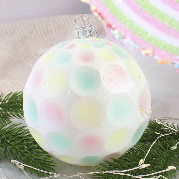 Новогоднее елочное украшение — шар диаметром 10 см, выполненный из пластика с матовой текстурой. Шар украшен нежным узором из разноцветных пастельных кругов в голубых, розовых и желтых оттенках, что придает ему мягкий и воздушный вид. Благодаря легкому и прочному материалу, этот шар станет прекрасным украшением для елки, создавая праздничную и уютную атмосферу в интерьере.