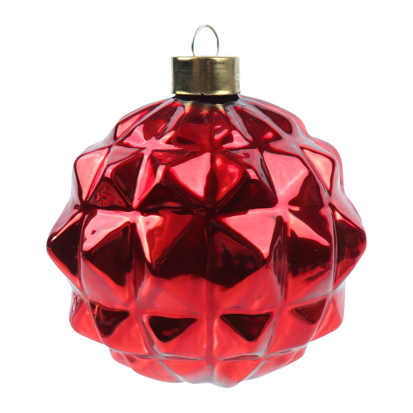 Ёлочное украшение в форме рельефного шара красного цвета – это стильный декоративный элемент в современном стиле лофт. Изделие выполнено из стекла с глянцевой поверхностью и выразительным гранёным узором, создающим эффект глубины и блеска. Красный оттенок придаёт украшению элегантность и холодную свежесть, отлично вписываясь в современный праздничный декор.