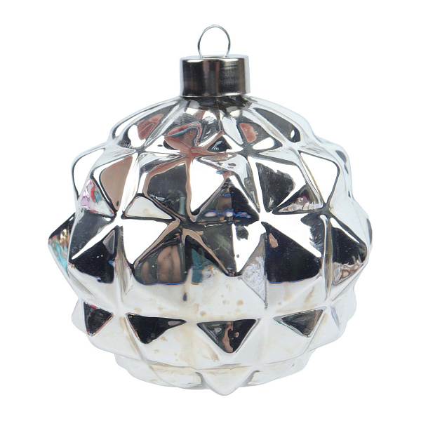 Ёлочное украшение в форме рельефного шара серебряного цвета – это стильный декоративный элемент в современном стиле лофт. Изделие выполнено из стекла с глянцевой поверхностью и выразительным гранёным узором, создающим эффект глубины и блеска. Серебряный оттенок придаёт украшению элегантность и холодную свежесть, отлично вписываясь в современный праздничный декор.
