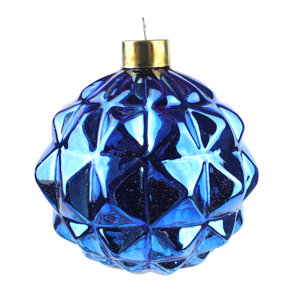 Ёлочное украшение в форме рельефного шара насыщенного синего цвета – это стильный декоративный элемент в современном стиле лофт. Изделие выполнено из стекла с глянцевой поверхностью и выразительным гранёным узором, создающим эффект глубины и блеска. Синий оттенок придаёт украшению элегантность и холодную свежесть, отлично вписываясь в современный праздничный декор.