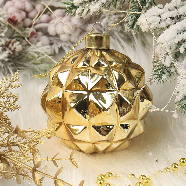 Ёлочное украшение в форме рельефного шара золотого цвета – это стильный декоративный элемент в современном стиле лофт. Изделие выполнено из стекла с глянцевой поверхностью и выразительным гранёным узором, создающим эффект глубины и блеска. Золотой оттенок придаёт украшению элегантность и холодную свежесть, отлично вписываясь в современный праздничный декор.