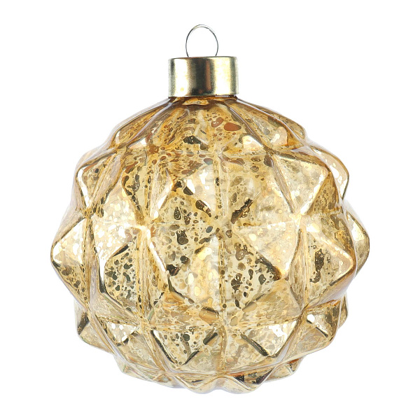 Ёлочное украшение в форме рельефного шара золотого цвета – это стильный декоративный элемент в современном стиле лофт. Изделие выполнено из стекла с глянцевой поверхностью и выразительным гранёным узором, создающим эффект глубины и блеска. Золотой оттенок придаёт украшению элегантность и холодную свежесть, отлично вписываясь в современный праздничный декор.