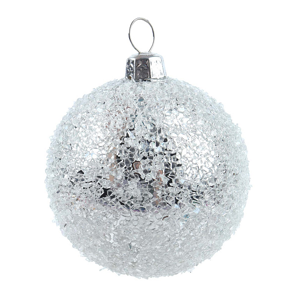 Елочное украшение в виде шара выполнено из пластика в винтажном стиле с серебристым покрытием и текстурой, имитирующей лед. Поверхность изделия украшена мелкими кристаллоподобными элементами, создавая эффект искрящегося инея и придавая украшению особую праздничную атмосферу. Диаметр шара составляет 6 см, что делает его удобным для декорирования елки и других новогодних композиций. Украшение оснащено металлическим колпачком и серебристой ниткой для подвешивания.