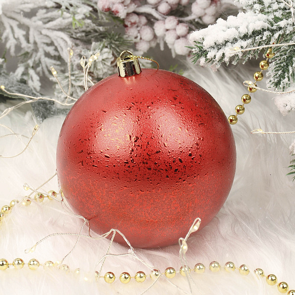 Ёлочное украшение в виде шара красного цвета с эффектом дождя — это стильный и элегантный элемент новогоднего декора в винтажном стиле. Изготовлен из лёгкого пластика, покрытого матовым финишем с декоративными блестящими каплями, которые создают имитацию капель дождя, придавая игрушке глубину и оригинальность.