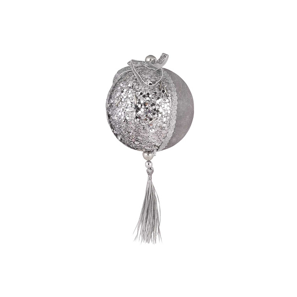 Необычный шар, сверкающий серебром, по достоинству оценят любители необычного интерьерного декора. Игрушка оформлена в винтажном стиле, щедро покрыта пайетками. Дополняют декор бусины, бант и роскошная кисть в нижней части. Украшение привлечет внимание сдержанным блеском, наполнит пространство таинственными бликами. Оно удивит детей, заинтересует взрослых, подчеркнет тематику торжества.